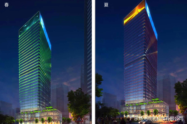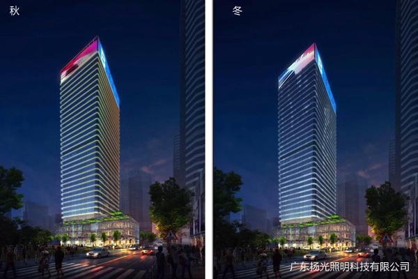 根據(jù)對(duì)建筑主體的解析,頂部在西北面設(shè)置LED顯示屏,東南面設(shè)置企業(yè)LOGO來增強(qiáng)建筑的標(biāo)識(shí)度,立面采用燈管色勒,有效的表現(xiàn)出建筑龍骨結(jié)構(gòu)的層次感,通過線條變化體現(xiàn)出城市高效發(fā)展的速度。