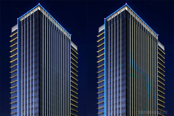 頂部半透明玻璃遮陽板后面投射燈光,營造發(fā)光效果;利用豎向鋁板線條鋪設(shè)燈光,燈光可電腦操控,可預(yù)設(shè)多種圖案;裙樓在樓板之間加燈光,要求發(fā)光亮度高。
