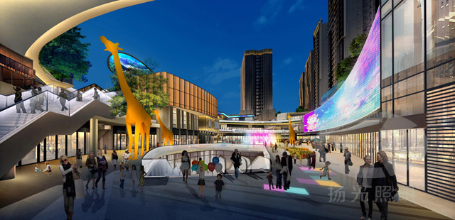 商業(yè)中心建筑外立面沿主干道季華二路沿線展開,不同體量感的場館通過連廊自由相接,色彩繽紛的玻璃幕墻,巨大而可愛的景觀造型動物圍繞,共同塑造出一個充滿童趣、夢幻歡樂的世界。