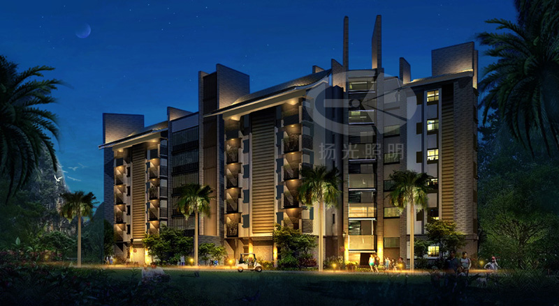 廣場商業(yè)街、宿舍位于項(xiàng)目中心位置,是人流聚集點(diǎn),夜間為亮度最高區(qū)域。運(yùn)用燈具大面積洗亮建筑頂部,使其成為區(qū)域內(nèi)的視覺焦點(diǎn)。吸引人群聚集于此。