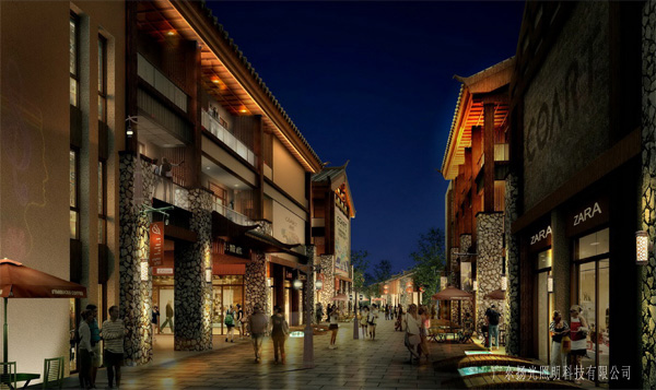 作為縱向街道通向街區(qū)的主要人氣通道,寬敞舒適,通過建筑立面的壁燈和景觀燈的結合,完成整個縱向空間的照明。