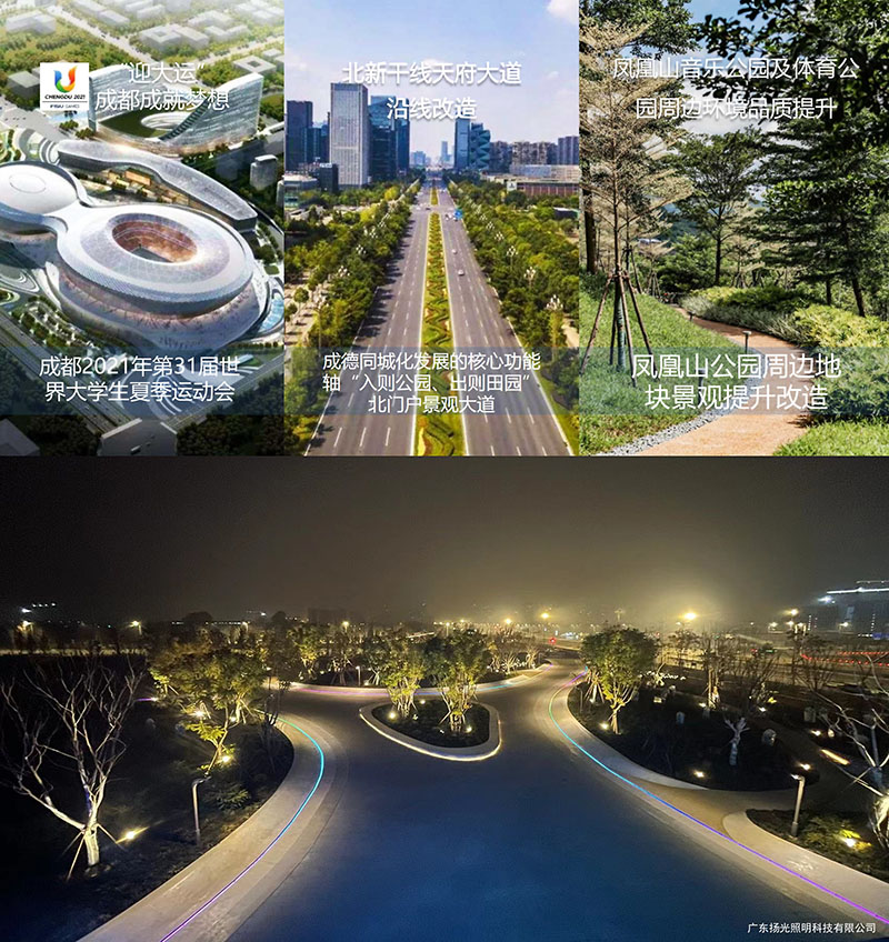 北星大道是成都向北聯(lián)系德陽的主軸,也是2021世界大學(xué)生運(yùn)動會的重要賽區(qū)所在地。而整個片區(qū)夜晚環(huán)境不足以表達(dá)區(qū)域特色,因此對北星大道兩側(cè),鳳凰山露天音樂公園及國際足球中心周邊場景進(jìn)行整治,既是大運(yùn)會期間的風(fēng)貌展示,也是城市發(fā)展的重要需要。