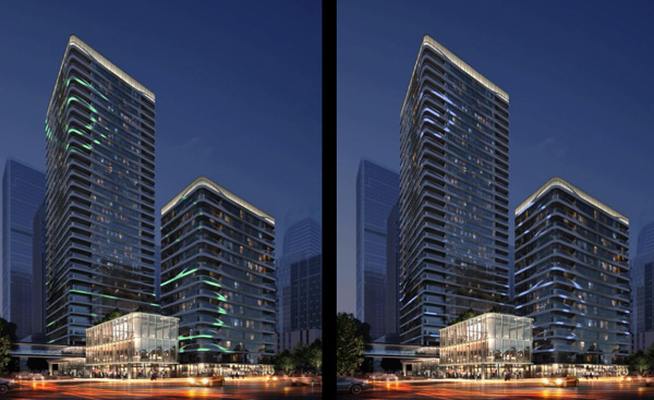 項(xiàng)目建筑與幕墻結(jié)構(gòu)以流暢線條與疊加元素為核心設(shè)計(jì)語(yǔ)言,既賦予建筑向上生長(zhǎng)的蓬勃張力與豐富的空間層次感,又以靈動(dòng)曲線勾勒出輕盈飄逸的動(dòng)態(tài)美感。為呼應(yīng)這一獨(dú)特的建筑風(fēng)格,我們的設(shè)計(jì)師們以燈光為創(chuàng)意畫(huà)筆,沿建筑結(jié)構(gòu)逐層鋪陳光亮,讓夜幕中的建筑呈現(xiàn)出層層遞進(jìn)、疊加累積的燈光韻律。