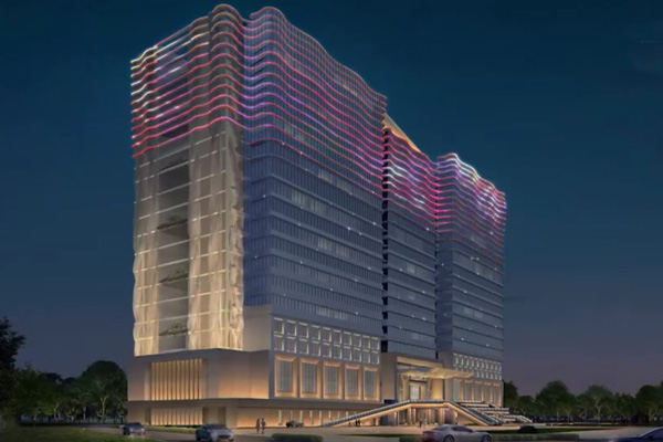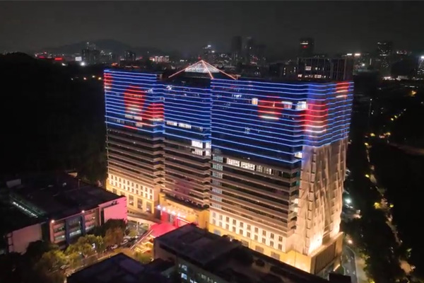 建筑頂部幕墻采用 RGBW 全彩燈光,通過智能控制,以立面動(dòng)態(tài)圖案與定制動(dòng)畫演繹企業(yè)形象,吸引多視角關(guān)注,深化企業(yè)品牌辨識(shí)度;控制系統(tǒng)設(shè)置平日、節(jié)假日模式,可根據(jù)不同節(jié)日定制專屬光影內(nèi)容,并與廣場(chǎng)噴泉實(shí)現(xiàn)光影聯(lián)動(dòng),營造不同的場(chǎng)景氛圍。樓身則以大功率燈光做整體烘托,通過光影塑造建筑體量,強(qiáng)化空間視覺存在感。